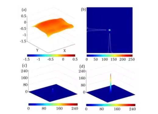 圖2.(a)自適應(yīng)光學(xué)系統(tǒng)校正后波前信息;(b) 自適應(yīng)光學(xué)系統(tǒng)校正后遠(yuǎn)場(chǎng)強(qiáng)分布;(c) 自適應(yīng)光學(xué)系統(tǒng)校正前遠(yuǎn)場(chǎng)強(qiáng)度分布(3D);(d) 自適應(yīng)光學(xué)系統(tǒng)校正后遠(yuǎn)場(chǎng)強(qiáng)度分布(3D)。
