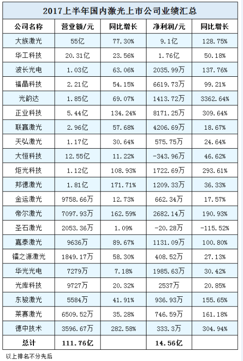 根據(jù)Laser Manufacture News發(fā)布的相關(guān)數(shù)據(jù),2017年上半年國內(nèi)已上市激光企業(yè)營收規(guī)模超20億元的,有大族激光、華工科技兩家。大族激光收入接近55億元,華工科技收則在20.31億左右。(數(shù)據(jù)來源2017上半年各公司財報)