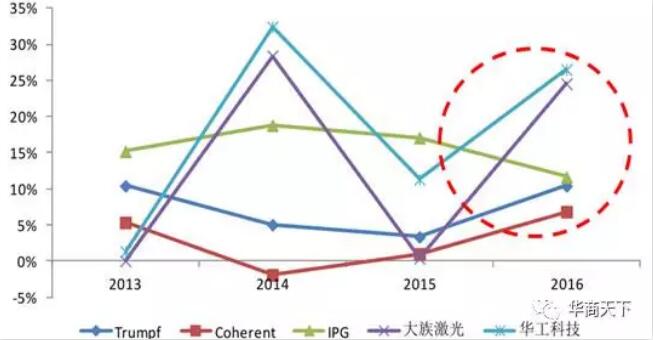 事實(shí)上,中國(guó)激光市場(chǎng)增長(zhǎng)速度已經(jīng)超過(guò)了歐美等國(guó)。2016 年,中國(guó)激光企業(yè)龍頭大族激光與華工科技的增長(zhǎng)率分別為 26.50%、24.55%,收入增長(zhǎng)均高于國(guó)外企業(yè)。