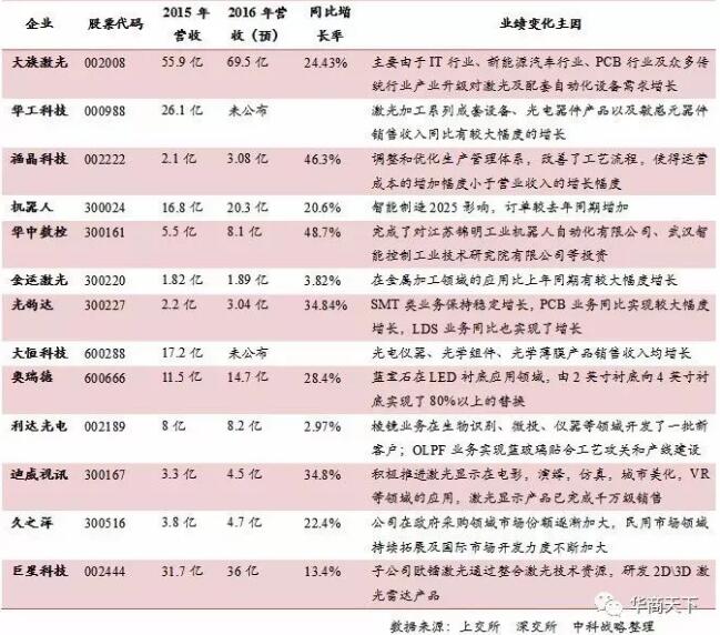 2016年國(guó)內(nèi)主板上市的激光企業(yè)營(yíng)收情況
