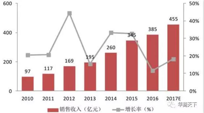 中國(guó)市場(chǎng)規(guī)模增長(zhǎng)迅速,2017年有望突破450億