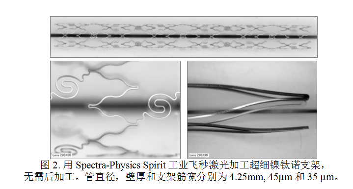 幾乎從一開始,支架制造就運用了納秒激光切割技術(shù)。然而,納秒激光與金屬的相互熱作用通常使加工完的金屬表面達(dá)不到最理想,毛刺、熔化和重鑄都是激光熔融切割的標(biāo)準(zhǔn)特征。此外,材料中熱積沉在切口旁邊產(chǎn)生了熱影響區(qū)(HAZ)。在熱影響區(qū)中,材料的物性或構(gòu)成會被改變。因此,清潔、去毛刺、蝕刻和最終拋光因此也被納入常規(guī)加工工序中,使支架表面性能達(dá)到植入設(shè)備標(biāo)準(zhǔn)水平,而通過使用飛秒激光進(jìn)行支架加工可以避免一些前面提到的后加工步驟。圖1顯示了由Spirit®激光加工的鎳鈦諾微型支架。關(guān)鍵特點包括嚴(yán)密的加工公差、無熱影響區(qū),脆性晶格結(jié)構(gòu)無熱誘導(dǎo)變形,以及非常干凈的切割邊緣。
