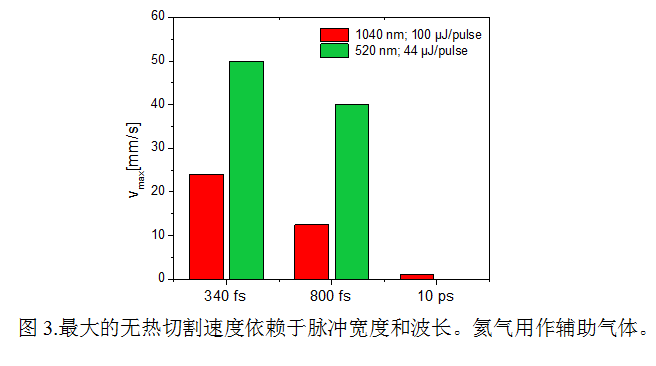 Spirit®HE激光系統(tǒng)已被用于研究通過單掃描消融來切割80μm厚的生物可吸收材料聚左乳酸(PLLA)帶的可行性。使用光學(xué)顯微鏡研究了加工質(zhì)量,圖3總結(jié)了在無熱式(無HAZ,無熔融,無重鑄等)機器框架內(nèi)最大切割速度,波長和脈沖寬度值都是實驗中用到的函數(shù)關(guān)系。為了提高激光切割性能,要使用6巴壓力的氦氣作為輔助氣體。