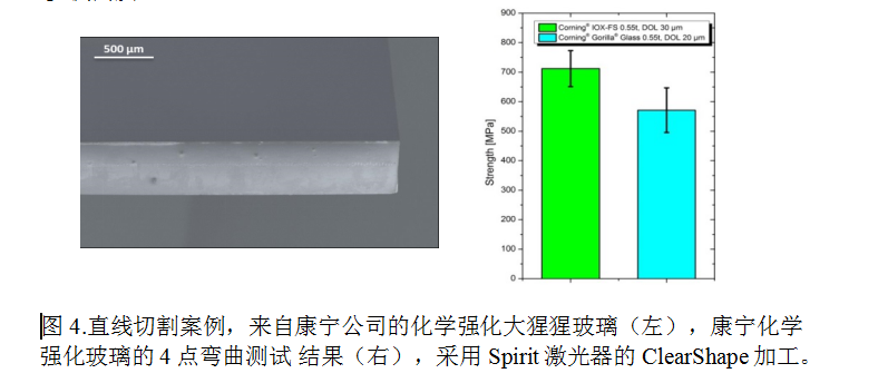例如,切割康寧的厚度為0.55毫米化學(xué)強化大猩猩玻璃,應(yīng)力層深度(DOL)為20μm,速度可達(dá)4米/秒。除了切削自由邊緣,使用ClearShape工藝實現(xiàn)了激光切割(由截面的平均粗糙度定義)<0.1μm的質(zhì)量(見圖四,左)。非常高的切割質(zhì)量使在玻璃的四點彎曲試驗期間達(dá)到了700MPa的極高的彎曲強度,而無須任何后處理步驟(圖4,右)。