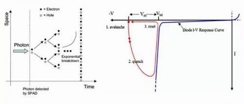 接收系統(tǒng)的主要功能是識別從發(fā)射器發(fā)出的和從物體上反射的光束。因此探測器需要非常靈敏,以至能夠探測到單個的光子。如今,最新的相關(guān)設(shè)備采用了SPAD(Single-Photon Avalanche Diode單光子雪崩二極管) 技術(shù)。