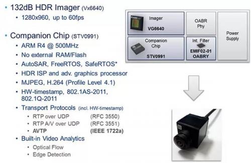 這一方法使后視攝像頭能夠壓縮信息并通過以太網(wǎng)傳輸?shù)杰嚈C主機上。圖5顯示了一個此類高度集成化的數(shù)碼后視攝像頭的技術(shù)細節(jié)。