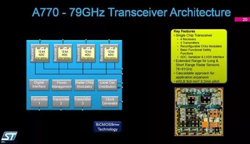 A770是一個單片集成收發(fā)器,包括了三個發(fā)射器、四個接收器、一個可調(diào)的鋸齒波發(fā)生器,一個集成的ADC(Analog to Digital Converter模數(shù)轉(zhuǎn)換器)和一個MIPI CSI II 接口。當(dāng)需要更多發(fā)射和接收通道時,這一模塊甚至可以被級聯(lián)起來。模塊被封裝在9mm*9mm的陶瓷EWLB(Embedded Wafer Level Ball Grid Array內(nèi)嵌式晶圓級球柵陣列)中,可以被用于中程和長程探測。