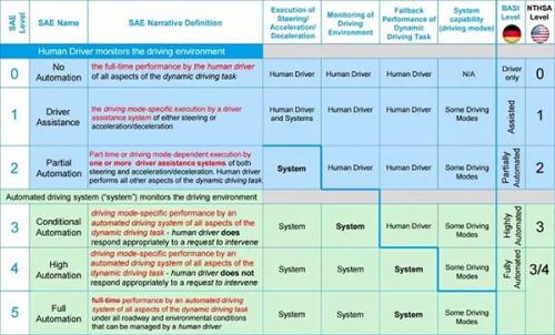 對于自動駕駛的不同類別劃分已經(jīng)在以下表一中列出了。這一分類在美國是基于國際工程與汽車工業(yè)協(xié)會SAE3016標準列出的,在歐洲則是聯(lián)邦高速公路研究所制定的。具體可以參考車云菌以往的文章(一篇文章讀懂NHTSA自動駕駛分級),這里不做贅述。