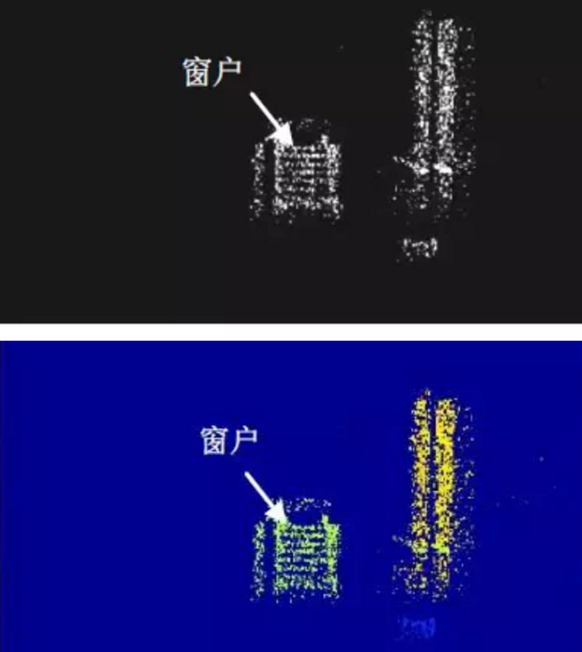 7 km處建筑物成像實驗(上圖:強度像  下圖:距離像)