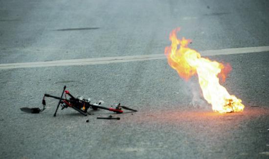 低空衛(wèi)士攻擊效,可以看到無人機(jī)部件已經(jīng)燃燒