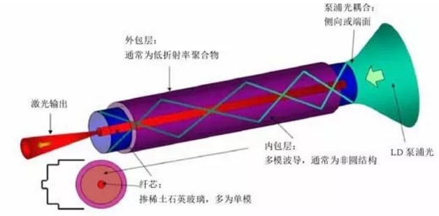 1988年,雙包層光纖出現(xiàn),使光纖激光器的輸出功率得到明顯提升。典型的雙包層光纖結(jié)構(gòu)包括纖芯、內(nèi)包層和外包層三部分,外包層折射率低于內(nèi)包層,因此抽運(yùn)光可以在內(nèi)包層中傳輸。內(nèi)包層的直徑和數(shù)值孔徑可遠(yuǎn)大于纖芯,便于高效耦合抽運(yùn)光。抽運(yùn)光在內(nèi)包層里經(jīng)多次全反射后,進(jìn)入摻稀土離子的纖芯被吸收,實(shí)現(xiàn)激光的產(chǎn)生或放大。包層抽運(yùn)技術(shù)的出現(xiàn)使光纖激光器輸出功率實(shí)現(xiàn)了由毫瓦級(jí)到瓦量級(jí)的提升。