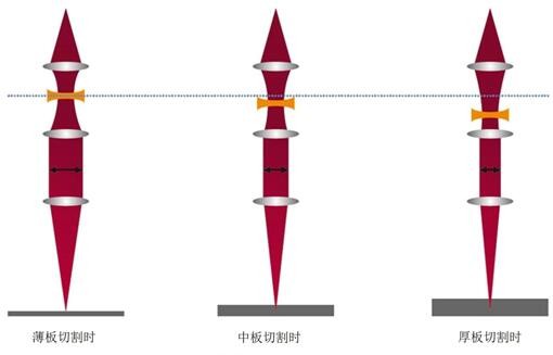 通常來說,激光切割必須先有起刀孔,尤其是切割厚板材料時(shí),穿孔質(zhì)量十分重要,優(yōu)良的穿孔是保證光束和氣流穩(wěn)定的基礎(chǔ),對(duì)萬瓦級(jí)激光切割而言,變焦穿孔技術(shù)是通過伺服電機(jī)控制擴(kuò)束鏡組與聚焦鏡的相對(duì)距離,實(shí)現(xiàn)聚焦光斑正負(fù)離焦量的變化,切割不銹鋼、鋁及鋁合金、黃銅及紫銅需要負(fù)離焦,厚度越大,負(fù)離焦越深(圖1)。采用伺服控制“雙凸—雙凹—雙凸”ZOOM鏡組,實(shí)現(xiàn)分級(jí)或無級(jí)調(diào)焦(圖2),高速動(dòng)態(tài)變焦穿孔,實(shí)現(xiàn)割縫斷面無斜度切割。采用光束整形技術(shù)、模式自動(dòng)變換控制技術(shù)、能量密度微積分技術(shù),實(shí)現(xiàn)大厚度不銹鋼及高反射材料的“亮面切割”。