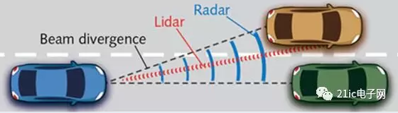 圖1 光束發(fā)散角取決于發(fā)射天線(雷達(dá))或透鏡(LiDAR)的孔徑和波長(zhǎng)的比值。此比例對(duì)于雷達(dá)產(chǎn)生的較大光束發(fā)散角和較小角分辨率來(lái)說(shuō)是偏大的。如圖,雷達(dá)(黑色)無(wú)法區(qū)分這兩輛車(chē),而LiDAR(紅色)則可以