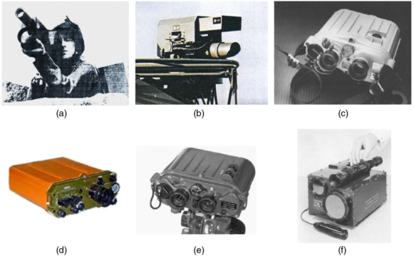 圖9. 早期激光測(cè)距儀的發(fā)展示例.(a)第一臺(tái)愛(ài)立信LRF試驗(yàn)設(shè)備(1965年);(b)瑞典海軍用LRF(1968年);(c)西姆拉德手持LP-7;(d)LRF KTD 2-2(極地, USSR);(e)LRF BD-1 (801研究所, USSR);(f)費(fèi)朗蒂CO2 TEA LRF.