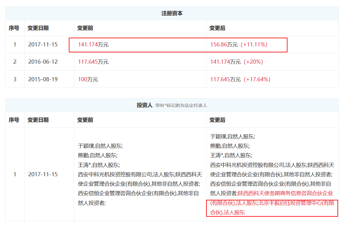 據(jù)“企查查”信息顯示,北京卓鐳激光技術(shù)有限公司工商信息于2017年11月15日發(fā)生變更,注冊資本從141.174萬元變更為156.86萬元,同時新增加2家企業(yè)股東——陜西西科天使叁期商務(wù)信息咨詢合伙企業(yè)(有限合伙),北京豐毅啟鈺投資管理中心(有限合伙)具體情況如下圖: