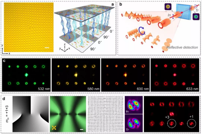 相位型渦旋光場(chǎng)的螺旋形波前可用Ψ1 = exp(imθ) 來(lái)進(jìn)行描述。對(duì)于這類光束,其坡印廷矢量雖然整體向前,但是有了橫向分量,其指向就在空間內(nèi)不停地打轉(zhuǎn),因此帶來(lái)了軌道角動(dòng)量。OAM賦予了光子調(diào)控一個(gè)全新的維度,打開(kāi)了一條光信息復(fù)用的新通道。拓?fù)浜蒻的無(wú)限性意味著OAM態(tài)也是無(wú)限的,因此,通過(guò)OAM復(fù)用可極大地增加無(wú)線及光纖通信的帶寬。將基于OAM的模分復(fù)用技術(shù)與現(xiàn)行的波分復(fù)用技術(shù)相結(jié)合一直是光學(xué)界熱切期盼解決的一項(xiàng)關(guān)鍵難題。現(xiàn)有的渦旋光束產(chǎn)生與檢測(cè)技術(shù),如模式轉(zhuǎn)換、螺旋位相板、Q-plate、叉形光柵等,都對(duì)波長(zhǎng)非常敏感,其效率隨波長(zhǎng)會(huì)發(fā)生顯著的變化,這嚴(yán)重制約了OAM復(fù)用技術(shù)的發(fā)展與應(yīng)用。
