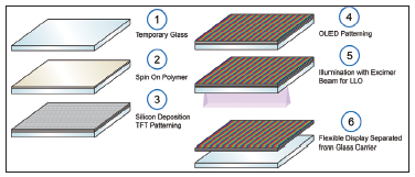圖1: 采用剛性載體和準(zhǔn)分子激光器剝離工藝制備柔性顯示屏的示意圖。