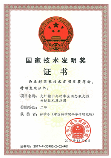 會(huì)上,以中科院半導(dǎo)體所研究員、江蘇中科四象激光科技有限公司首席專家林學(xué)春研究員及江蘇中科四象激光科技有限公司總經(jīng)理林培晨為發(fā)明人代表的“光纖輸出高功率全固態(tài)激光器關(guān)鍵技術(shù)及應(yīng)用” 項(xiàng)目榮獲國家技術(shù)發(fā)明獎(jiǎng)二等獎(jiǎng)。
