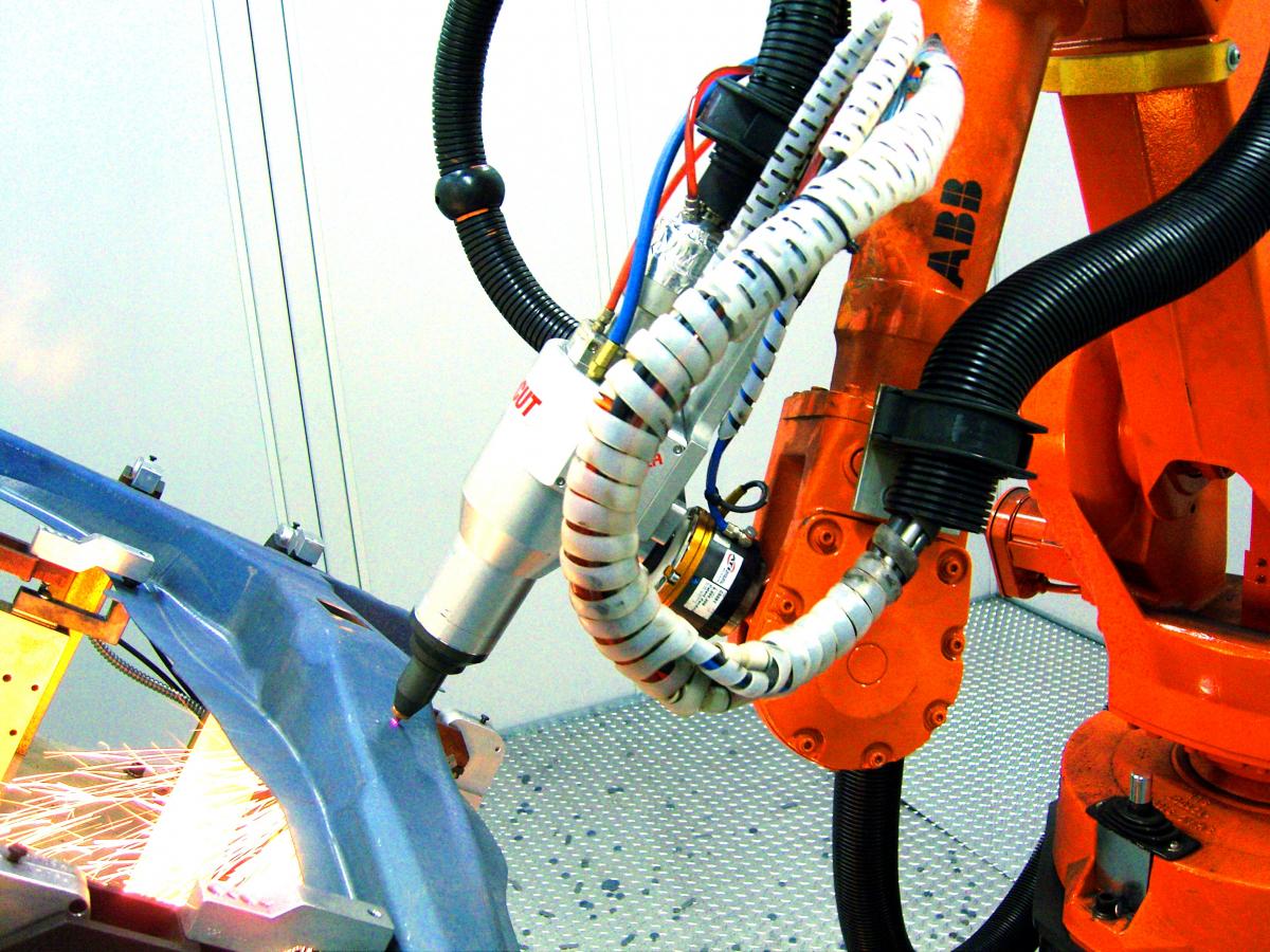 機(jī)器人激光切割是一種通過(guò)工業(yè)機(jī)器人實(shí)現(xiàn)的多方向、多角度的柔性切割方法。激光機(jī)器人切割系統(tǒng)一般由機(jī)器人手臂、材料定位器、機(jī)器人控制器和機(jī)械手末端工具 (EOAT)組成。機(jī)器人通過(guò)操控工具或工件來(lái)完成任務(wù)。