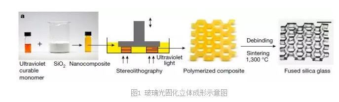 當玻璃樹脂黏度較高,流動性較差時,則可采用倒置式打印。工作臺浸沒在樹脂中,紫外光按零件切片輪廓信息從下往上照射使之固化。當一層薄層固化完成之后,工作臺上升一個層厚,進行新一輪固化。如此反復,直至零件打印完成。將打印出的坯件放入爐子中進行熱處理,按照設定好的溫度制度、焙燒氣氛和壓力進行熱處理。這個過程分為兩個階段:根據(jù)選用的有機物加熱到特定溫度脫去坯體中的有機物,這是十分敏感容易出現(xiàn)缺陷的階段;加熱到1000 ℃以上實現(xiàn)致密化、形成玻璃,燒結完成等冷卻后便可得到最終的玻璃產品了??蓞⒁娤聢D1。