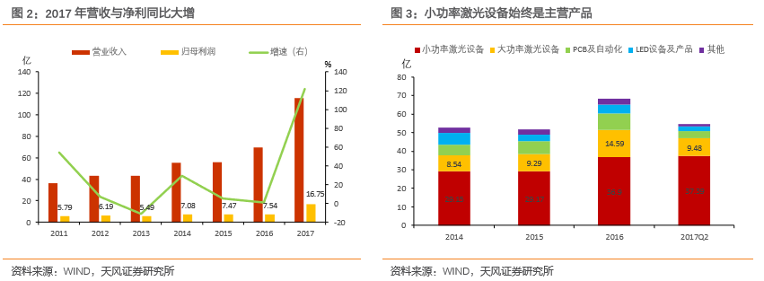 經(jīng)過多年擴張,公司已從初期單一的小功率激光打標產(chǎn)品發(fā)展到目前以大小功率激光設備、PCB 及自動化配套設備為主的幾大生產(chǎn)線。根據(jù)2017年業(yè)績快報,公司實現(xiàn)營業(yè)收入115.6億,其中歸母凈利16.75億,較上年同比大幅增長122%。