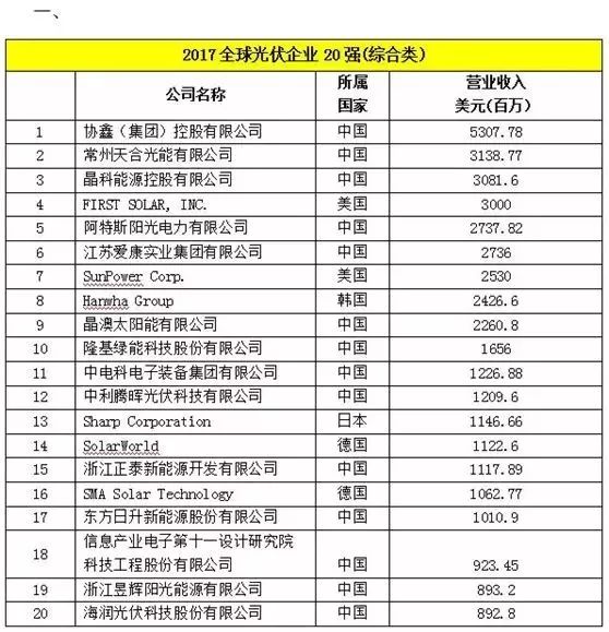 在光伏領(lǐng)域,中國(guó)公司已經(jīng)占據(jù)了全球壟斷地位,下圖是2017年4月365光伏發(fā)布的全球光伏20強(qiáng),這是一個(gè)綜合性排名,不只是組件,還包括電池片,硅片等,外國(guó)公司只有6家,其中美國(guó)2家,德國(guó)2家,韓國(guó)和日本各1家。