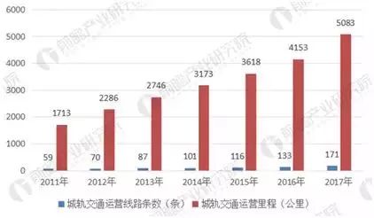 2016年末,中國(guó)大陸共計(jì)30個(gè)城市開(kāi)通軌道交通運(yùn)營(yíng),運(yùn)營(yíng)線(xiàn)路長(zhǎng)度達(dá)高達(dá)4153公里。到2017年12月31日,中國(guó)大陸35座城市開(kāi)通運(yùn)營(yíng)軌道交通線(xiàn)路,總里程高達(dá)5083.45公里。一年的時(shí)間全中國(guó)軌道交通線(xiàn)路長(zhǎng)度增長(zhǎng)了22.4%(數(shù)據(jù)來(lái)源:前瞻產(chǎn)業(yè)研究院)。