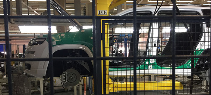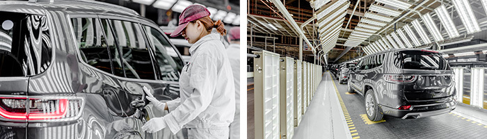 在總裝車間我們常說的“合車”,就是這最后一步了。底盤總成會在傳送帶上,涂裝好的車身被吊臂舉起,將車身與底盤合為一體。合車結(jié)束后,傳送帶會將組裝好的Jeep大指揮官傳送到車門組與內(nèi)飾組等,大指揮官就此“誕生”。