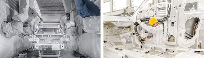 焊接過后,整部車的車身結(jié)構(gòu)已經(jīng)有了雛形,下一步是涂裝車間??蚣車娡康灼岵⒉皇俏覀兿胂蟮哪敲春唵?,首先需要對整體框架表面進(jìn)行100%清潔,然后送入無塵車間進(jìn)行磷化、電泳等化學(xué)表面處理,最后再由機器手噴漆。Jeep大指揮官采用了42臺機器人可連續(xù)同時每小時噴涂32輛,這套工藝對車間環(huán)境要求非常嚴(yán)苛,其次對機器要求也非常高,稍有疏漏就會極大的影響整體質(zhì)感??涨蛔⑴莨に囋谕墑e已成為主流,這套工藝會使之車身強度更高,而且防腐蝕、防漏水。