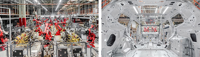 材料篩選好后接下來就需要焊接了,整個焊接車間共有491臺全自動化機器人,自動化焊接率達(dá)到75%(中上水準(zhǔn)),柔韌切換達(dá)到100%。對于車身框架結(jié)構(gòu)來說,我們主要熟知的就是激光焊接了,可以保證車身的剛度更高,并且精度以及效率也有良好的保證。