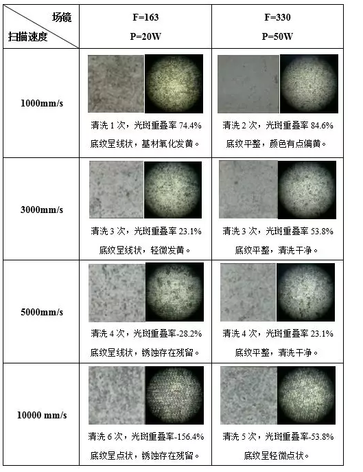 (3)實驗表明銹蝕清洗干凈,且基材不出現(xiàn)明顯氧化的重疊率范圍約為:20%~50%(理論計算圓形光斑覆蓋清洗區(qū)域的最小重疊率為25%)。在足夠的功率密度時,綜合清洗效果及效率,工藝設置時應使光斑重疊率>20%即可。