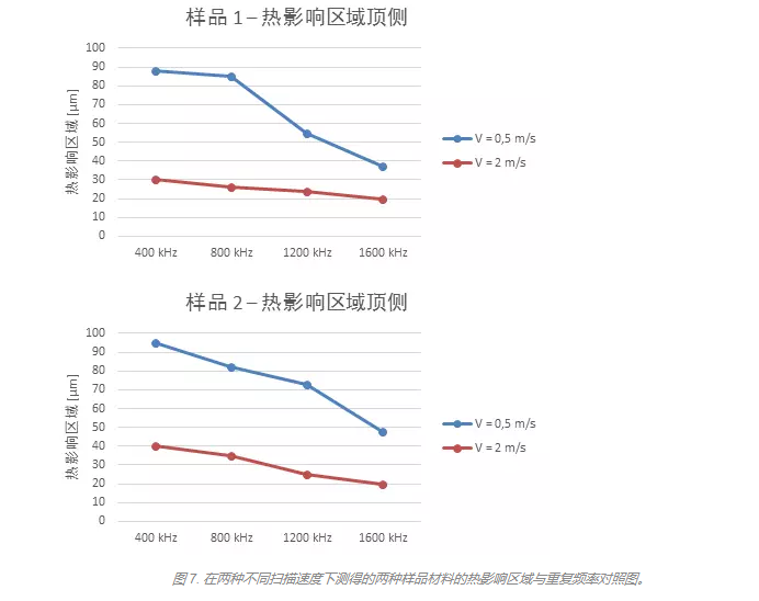下一組圖表對這些結(jié)果進(jìn)行了量化。圖中顯示了兩種掃描速度的結(jié)果:較低的掃描速度為 0.5 m/s,代表的是采用轉(zhuǎn)換平臺在固定光束輸出下移動樣品的設(shè)置;較高的掃描速度為 2 m/s,代表的是使用商用掃描振鏡輸出的光束。具體而言,前兩張圖表顯示,對于測試的兩種材料,熱影響區(qū)域隨著重復(fù)頻率的提高而穩(wěn)步減小,其中使用兩種掃描速度的較低者 (0.5 m/s) 時(shí)的改善最大。在上述操作條件下,樣品 1 的熱影響區(qū)域減小系數(shù)接近于 2.5。
