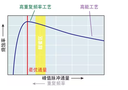 峰值脈沖通量是脈沖能量、焦點(diǎn)大小和脈沖寬度的函數(shù)。但假設(shè)激光器及其光學(xué)系統(tǒng)的聚焦光束特性不變,則峰值通量主要是脈沖能量的函數(shù)。如果激光器的平均功率保持恒定,則峰值脈沖通量與重復(fù)頻率成反比(因?yàn)槠骄β?= 脈沖能量 x 重復(fù)頻率)。本圖 x 軸也可以表示“重復(fù)頻率”,其數(shù)值從左向右遞減,這直接對應(yīng)于不斷增加的脈沖能量/峰值脈沖通量(所有其他因素保持不變)。