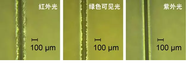 圖 2. 使用相干公司的 HyperRapidNX 激光器(分別輸出紅外光、綠色可見光和紫外光)在玻璃上刻劃的220 µm 厚的模擬顯示層。上圖可證明降低波長對改善切割質(zhì)量的影響。