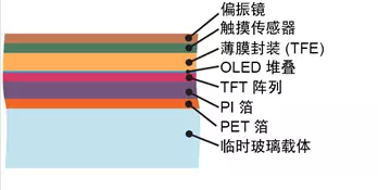 圖 1. 典型柔性 OLED 結(jié)構(gòu)的簡化示意圖(未按比例尺繪制)。在加工期間的某個(gè)時(shí)間點(diǎn)會移除玻璃載體。