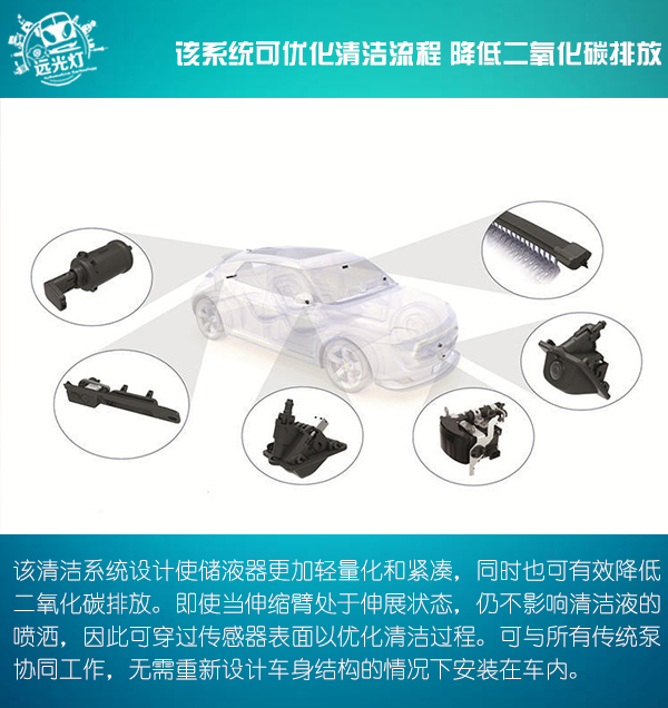 該清潔系統(tǒng)設(shè)計(jì)使儲(chǔ)液器更加輕量化和緊湊,同時(shí)也可有效降低二氧化碳排放。即使當(dāng)伸縮臂處于伸展?fàn)顟B(tài),仍不影響清潔液的噴灑,因此可穿過傳感器表面以優(yōu)化清潔過程。