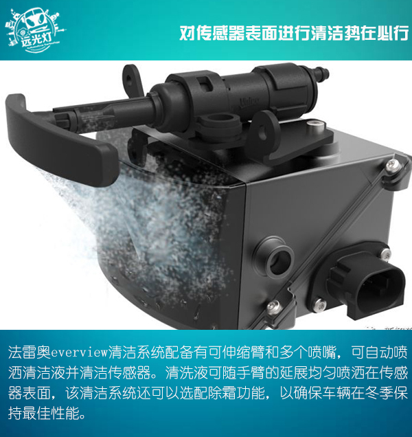 在這樣的情況下,為傳感器配置清潔系統(tǒng)就顯得迫在眉睫。法雷奧everview清潔系統(tǒng)配備有可伸縮臂和多個(gè)噴嘴,可自動(dòng)噴灑清潔液并清潔傳感器。該系統(tǒng)每次清潔僅需25ml清潔液,相比其他手動(dòng)清潔系統(tǒng)每次需100ml更為節(jié)省。清洗液可隨手臂的延展均勻噴灑在傳感器表面,該清潔系統(tǒng)還可以選配除霜功能,以確保車輛在冬季保持最佳性能。