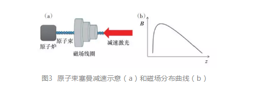 為提高原子束的減速效率,需要在減速過程中連續(xù)地補償多普勒頻移。采用的一種方案是連續(xù)掃描激光的頻率,使激光與原子躍遷頻率持續(xù)保持共振;另一種是保持激光的頻率不變,利用磁場對原子塞曼效應,改變原子的躍遷頻率,稱為塞曼減速。如圖3所示,采用磁場線圈可以實現(xiàn)強度隨空間變化的磁場,設計磁場分布曲線,使原子躍遷頻率的變化與多普勒頻移匹配,原子在行進過程中與激光持續(xù)作用,速度不斷降低,實現(xiàn)激光減速過程。