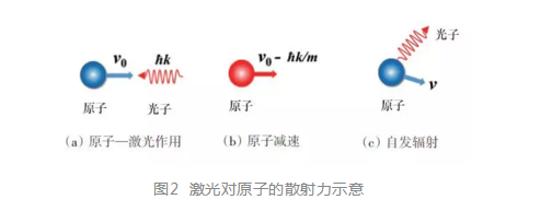 激光對原子的操控依賴于光對原子的機械作用,這種作用源于光的電磁場性質(zhì),且與原子的內(nèi)部和外部狀態(tài)相關。圖2用簡化為一維的模型介紹基本原理。一個初速度為ν0的原子受到一束反向的近共振頻率紅移光照射,當光的頻率紅移與原子速度ν0產(chǎn)生的多普勒頻移大小相等符號相反,光與原子躍遷頻率共振,原子吸收1個光子(動量為?k)由基態(tài)躍遷至激發(fā)態(tài),同時速度降低為ν0-?k/m,m 為原子質(zhì)量。處于激發(fā)態(tài)的原子在有限時間內(nèi)發(fā)生自發(fā)輻射,回到基態(tài),自發(fā)輻射光子的方向隨機。回到基態(tài)的原子將再次與光作用,形成循環(huán)躍遷。由于自發(fā)輻射光子的方向隨機,原子n 次(n 足夠大)作用自發(fā)輻射的累積平均動量為0,而經(jīng)歷n 次受激吸收,原子的速度變?yōu)?nu;0-n?k/m,實現(xiàn)激光對原子的減速。