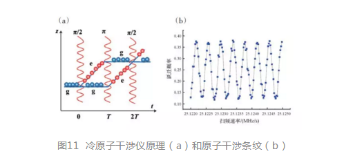 冷原子干涉儀的基本原理如圖11所示,利用MOT制備處于基態(tài)g的冷原子團。初始時刻,利用2束脈沖時間為τ 的拉曼激光脈沖作用至該原子團,原子有50%的概率被雙光子受激拉曼躍遷到e能級;同時,受到光子的動量反沖作用,在z 方向上e能態(tài)的原子與g能態(tài)原子分離,即實現(xiàn)冷原子團“分束”。經(jīng)過時間T后,再利用作用時間2τ 的拉曼激光脈沖,使e態(tài)的原子返回g態(tài),處于g態(tài)的原子躍遷至e態(tài),同時,原子運動軌跡發(fā)生改變,即實現(xiàn)冷原子團“反射”。最后利用脈沖時間為τ的拉曼激光,完成原子的“合束”。探測處于e態(tài)(或g態(tài))原子的數(shù)目,得到圖11(b)的原子干涉條紋。在冷原子干涉路徑上,重力等外場因素將引起干涉相位的變化,因此可以利用原子干涉儀測量重力加速度等。