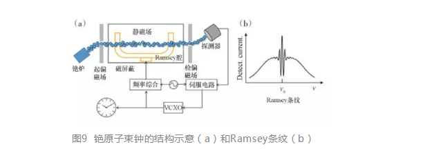 1950年,美國Ramsey提出原子與2個分立微波場作用的方案,使得原子鐘鑒頻從Rabi 躍遷轉變到Ramsey躍遷,有效壓縮原子鐘躍遷線寬,從而改變鑒頻靈敏度。分立微波場首先在熱原子束鐘里以空間分立的布局實現(xiàn)。1955年,英國國家物理實驗室(NPL)的Essen研究組建成了世界上第一臺銫原子鐘。1967年國際計量大會將時間單位秒的定義從天文秒改為基于銫原子(133Cs)基態(tài)超精細分裂微波輻射頻率9192631770 Hz的原子秒。自那時起,實驗室型銫基準鐘提供復現(xiàn)秒定義的手段。圖9為熱銫束原子鐘的原理示意。銫原子從銫爐中噴出后形成準直原子束,在起偏磁場的作用下,特定能態(tài)的原子運動方向偏轉,進入到微波腔中,原子與Ramsey腔中空間分立的微波場作用,再經(jīng)過檢偏磁場,由探測器得到原子信號。在電子環(huán)路中,由壓控振蕩器(VCXO)產(chǎn)生頻率信號,經(jīng)過頻率綜合生成9.19 GHz微波信號饋入Ramsey腔,掃描微波頻率可以得到圖9(b)的Ramsey 條紋,利用Ramsey中心條紋“鑒頻”,伺服鎖定VCXO頻率,將9.19GHz微波頻率鎖定到Ramsey中心條紋的秒定義頻率。