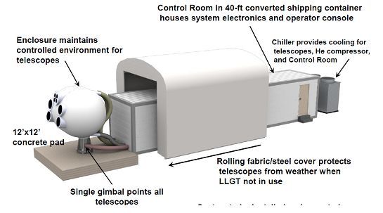 LLGT為L(zhǎng)LCD的主要地面終端,這是一個(gè)移動(dòng)型地面接收系統(tǒng)。具有溫控外殼,高約4.5m,總質(zhì)量7t,與目前的無(wú)線電通信地面天線相比,尺寸和重量減少約75%。 LLCD 的目標(biāo)之一是演示驗(yàn)證多孔徑合成光信號(hào)收發(fā)技術(shù)。