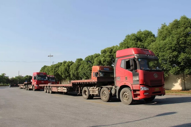 圖一:廠區(qū)里等著排隊(duì)裝貨的17.5米長(zhǎng)的大貨車
