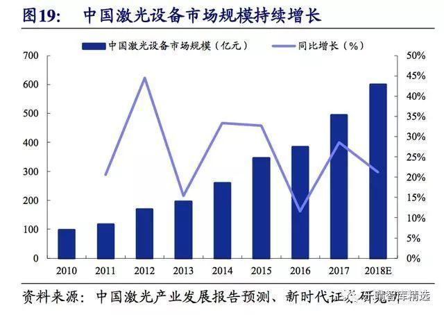 根據(jù)2018年3月發(fā)布的2018年中國激光產(chǎn)業(yè)發(fā)展報告,預計2018年中國激光設備市場規(guī)模將超過600億元、同比增長超過20%。
