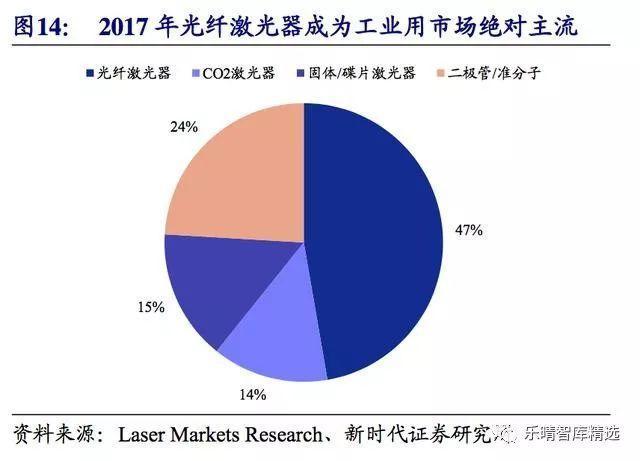 根據(jù)LaserMarketsResearch統(tǒng)計,2017年光纖激光器占工業(yè)用激光器的比重為47%、較2013年的34%提升13個百分點。