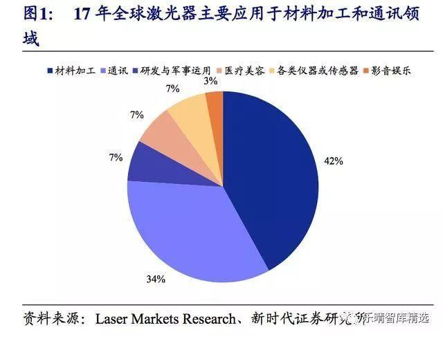 2017年全球激光器應用于材料加工和通訊領(lǐng)域、分別占42%和34%;從應用形式來看,切割占35%、焊接占16%、打標占15%。