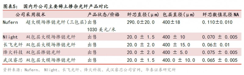 增益介質(zhì)主要作用是產(chǎn)生光子,一般采用摻雜稀土元素的光纖作為增益介質(zhì)。泵浦源的作用是對增益介質(zhì)進行激勵使其輻射發(fā)光。光纖介質(zhì)與國外最先進技術(shù)尚存在差距,在售產(chǎn)品參數(shù)上較接近但是穩(wěn)定性和一致性有待提高。國內(nèi)廠商雖然掌握泵源制造技術(shù),但核心激光芯片仍依賴進口。