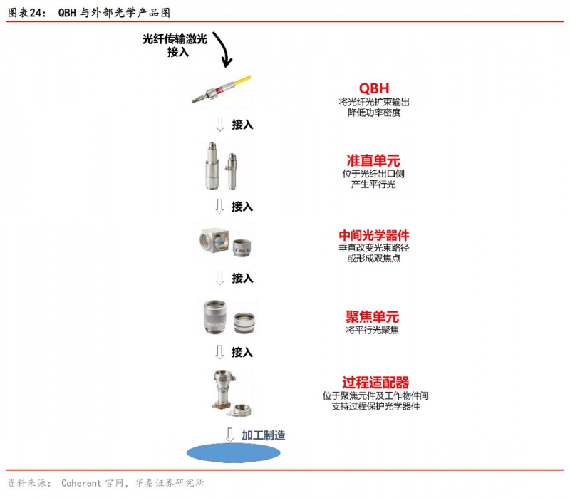 光纖輸出器件主要作用是進行光纖擴束降低功率密度以便使用,國內(nèi)主要激光器制造商銳科與創(chuàng)鑫已經(jīng)掌握QBH及準直器技術(shù),目前國內(nèi)廠商QBH器件部分參數(shù)上已經(jīng)與國外廠商相當。