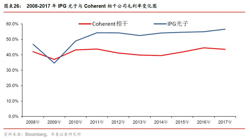 國內(nèi)廠商已掌握大部分器件制造技術(shù),但光纖介質(zhì)、高功率激光芯片和光纖光柵核心元器件仍依賴進口,除此之外的核心元器件技術(shù)已被掌握,而國外激光器龍頭IPG光子、Coherent依靠全產(chǎn)業(yè)鏈整合實現(xiàn)產(chǎn)品低成本和性能高穩(wěn)定性。目前國內(nèi)廠商毛利率水平較高,核心元器件若進一步國產(chǎn)化有望為國內(nèi)廠商業(yè)績提供充足支撐。