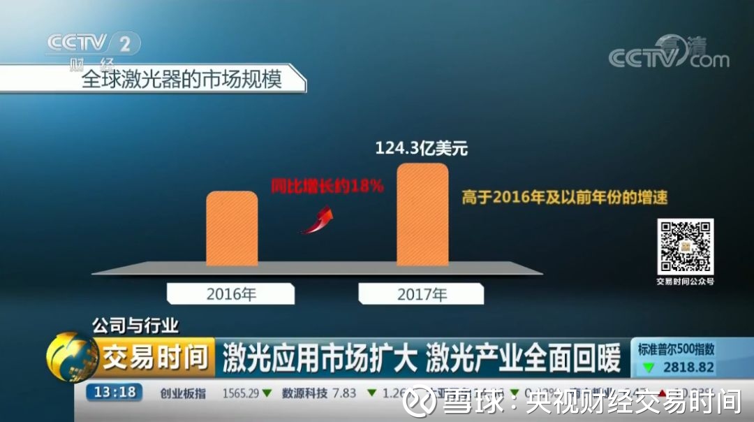 在經(jīng)歷了2016 年的增速放緩后,激光產(chǎn)業(yè)迎來(lái)全面快速增長(zhǎng)。根據(jù)中國(guó)科學(xué)院武漢文獻(xiàn)情報(bào)中心等機(jī)構(gòu)發(fā)布的《2018 中國(guó)激光產(chǎn)業(yè)發(fā)展報(bào)告》統(tǒng)計(jì),2017年全球激光器的市場(chǎng)規(guī)模達(dá)到124.3億美元,同比增長(zhǎng)約18%,高于2016年及以前年份的增速。激光設(shè)備方面,2017年中國(guó)工業(yè)、信息、商業(yè)、醫(yī)用和科研領(lǐng)域的激光設(shè)備(含進(jìn)口)市場(chǎng)銷(xiāo)售總收入高達(dá)495億元,同比增長(zhǎng) 28.6%。